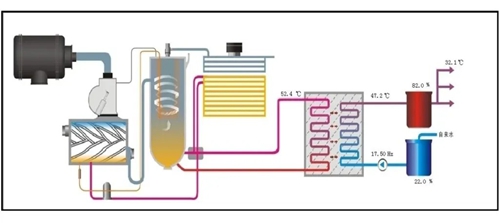• 当空压机正常运行,冷却油温度升高到温控阀额定温度75度以上后,就会进入余热回收热交换器内,将热量传递给冷却水,然后变成低温油后进入空压机换热器,最后回到主机。