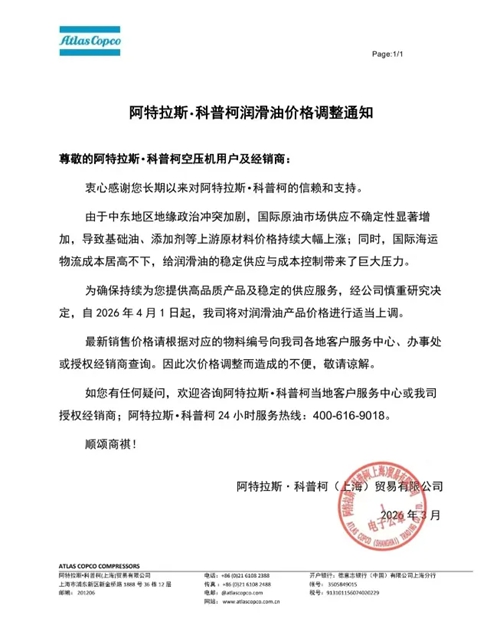 阿特拉斯·科普柯在通知中表示,由于中东地区地缘政治冲突加剧,国际原油市场供应不确定性增加,导致基础油、添加剂等上游原材料价格持续大幅上涨,同时国际海运物流成本也居高不下,给润滑油的稳定供应与成本控制带来了巨大压力。因此,公司决定对润滑油产品价格进行适当上调。