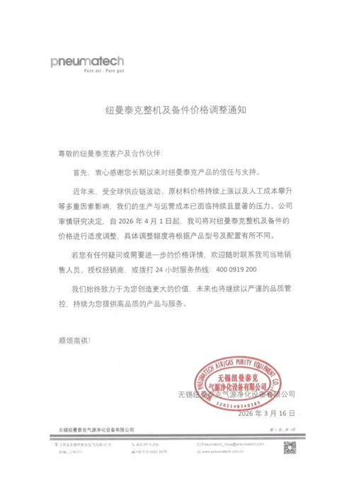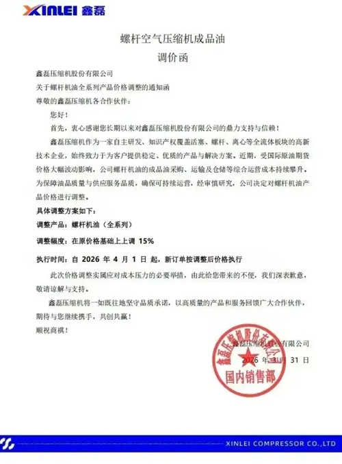 近日,阿特拉斯·科普柯、鲍斯以及鑫磊等多家知名压缩机企业相继发布通知,宣布自2026年4月1日起对部分产品价格进行调整。此次价格调整主要涉及润滑油及螺杆空压机专用冷却液等相关产品,涨幅在15%至20%不等。